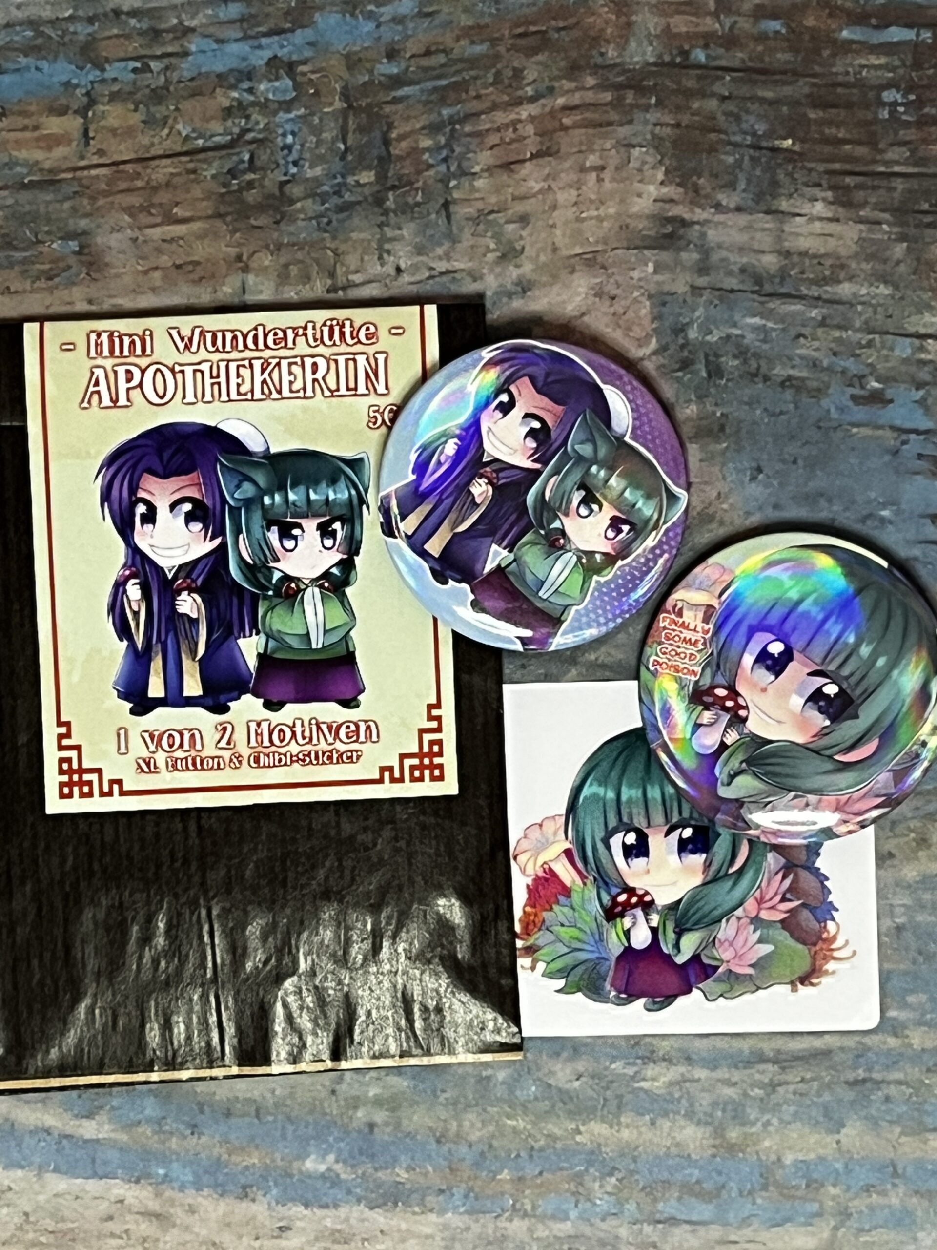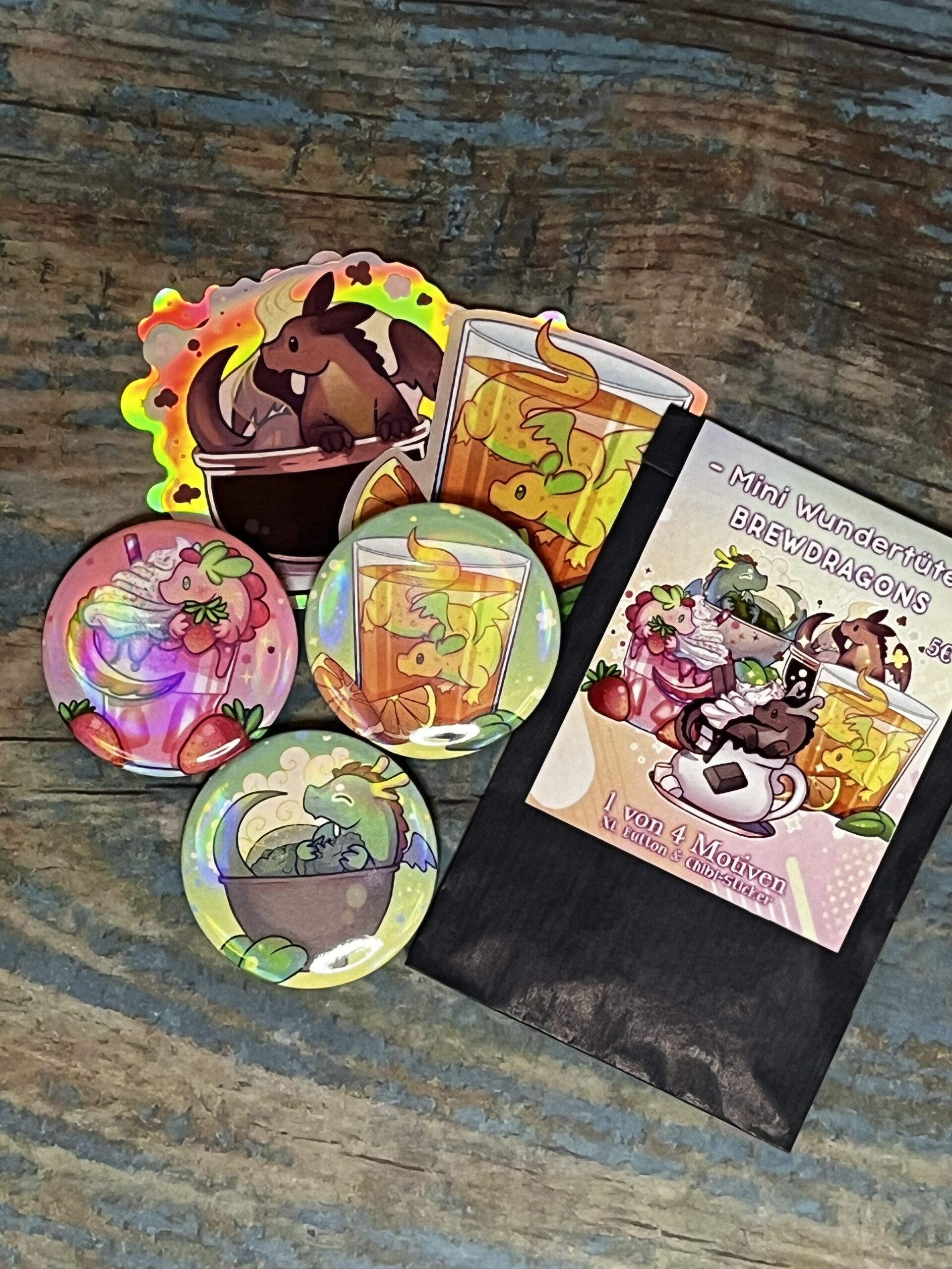 Unsere handgefertigten Wundertüten enthalten einen holographischen Button 42mm und einen Transfer- und Holosticker.